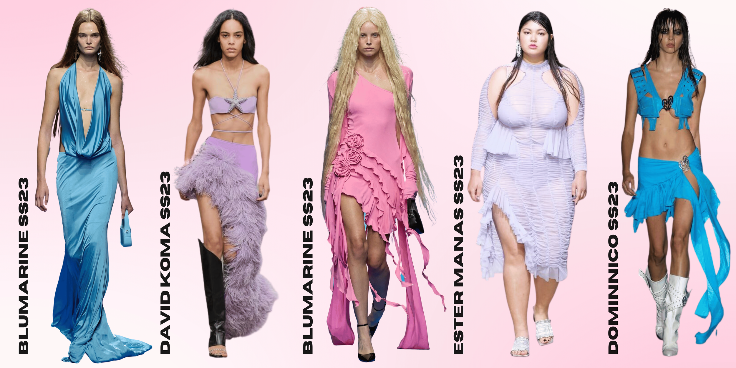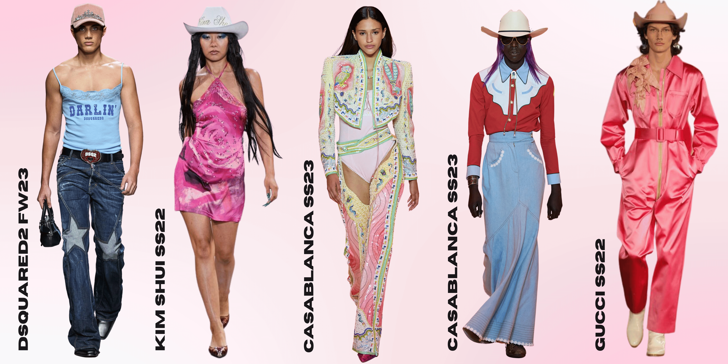 Another contributor to the shortened lifespan of trend cycles has been the search for uniqueness, as people explore creative expression through clothing as a way to differentiate themselves. Once they see a new trend they like, they grow tired of the former and continue exploring. Barbiecore has outlasted its fellow trends for years because it has something for everyone and leaves room for individual expression - one of the most empowering traits of Barbie’s character is that she can be anything: a president, a doctor, an astronaut, a physicist, even a mermaid. These Barbie personas have inspired the emergence of other Barbicore spinoff trends, melding other aesthetics with Barbiecore for very clear-cut looks that reflect the different dolls, such as Mermaid Barbie and Cowboy Ken. Blumarine’s recent shows give us Barbie Mermaid realness, with draped silhouettes that feature dramatic flyaways and ruffles reminiscent of the ocean. Runway shows from DSquared2 and Casablanca show off their takes on American Western wear, poking fun with ironic styles that deliver hints of Barbiecore - such as a pink bedazzled dress and femme graphic cami.